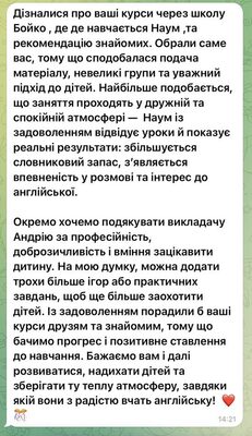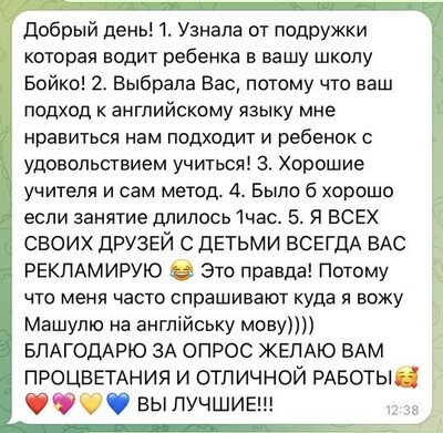 27 років досвідупідготувала до екзаменів Cambridge English, IELTS, TOEFL більше 700 людейМає сертифікат САЕ національний переможець Exellence in Teaching30 сертифікатів за участь в різних тренінгах і програмах